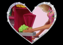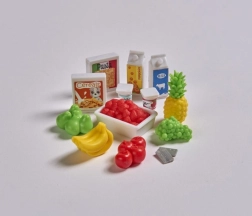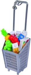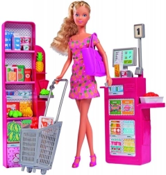 Puppe Steffi im Supermarkt mit Kasse, Einkaufstasche und vielen Lebensmitteln. Puppengröße 29 cm.