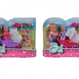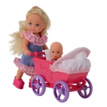 Evi mit Baby im tiefen Kinderwagen bietet Spaß für kleine Pflegerinnen. Praktische Zubehörteile sind im Set enthalten.