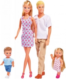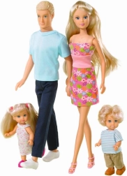Das Familien-Set Steffi-Puppen ermöglicht es Kindern, Geschichten zu erzählen und verschiedene Szenarien mit den Figuren Steffi, Kevin, Timmy und Evi zu schaffen.