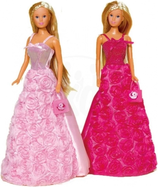 Die Puppe Steffi ist in einem wunderschön detailliert gestalteten Kleid mit rosafarbenen Blumenmotiven gekleidet.