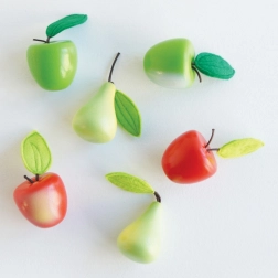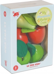 Sechs Obststücke mit Filzblättern in einer Holzkiste mit Griffen. Ideal in der Größe für kleine Kinderhände und für viel thematischen Spielspaß.