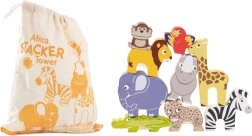 Dieses verspielte Set bringt ein Stück Wildnis ins Kinderzimmer. Kinder können aus den Tieren – Giraffe, Löwe, Elefant, Zebra, Affe, Nashorn, Gepard, Krokodil und Papagei – einen möglichst hohen Turm bauen und dabei Gleichgewicht, Geduld und Vorstellungskraft trainieren. Balancespiele fördern logisches Denken und unterstützen die Wahrnehmung von Formen und Farben.