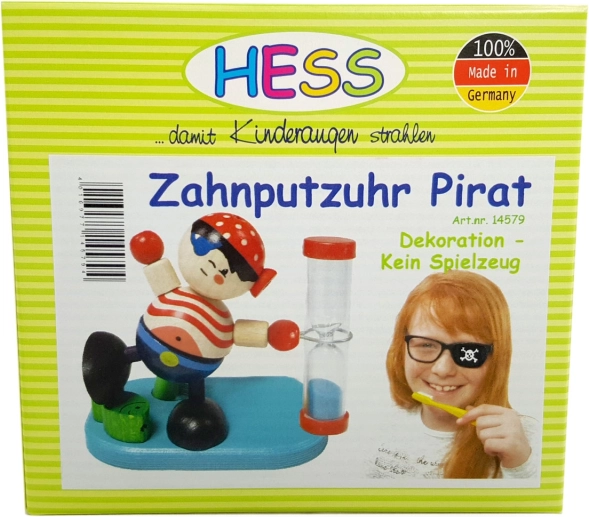 Machen Sie die tägliche Hygiene für Kinder angenehmer mit der verspielten Piraten-Sanduhr von HESS. Die Uhr misst ideale 2 Minuten Putzzeit, hat einen praktischen Zahnbürstenhalter und ist aus hochwertigem unbehandeltem Holz in Deutschland gefertigt.