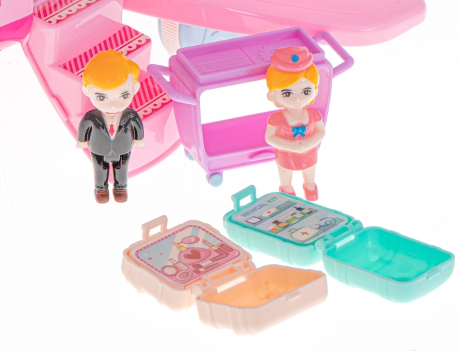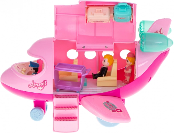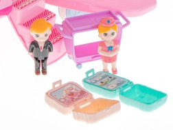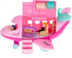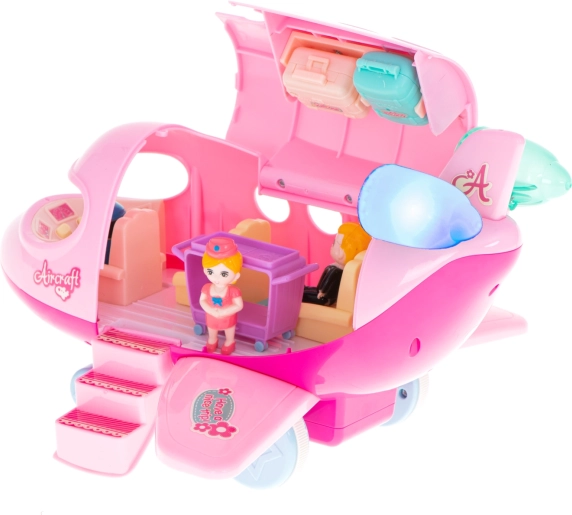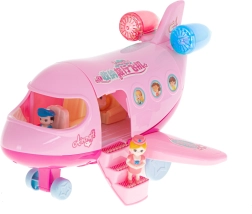 Beim Drücken der Knöpfe gibt es Geräusche bekannt von einem echten Flughafen ab, einschließlich der Landung. Es leuchtet mit bunten LED-Lichtern. Das Flugzeug spielt außerdem Melodien. Das Flugzeug ist mit beweglichen Rädern ausgestattet. Im Flugzeug wartet auf die Passagiere der Pilot. Er nimmt an Bord einen eleganten Reisenden und eine Flugbegleiterin. Während des Fluges ist neben der atemberaubenden Aussicht aus dem Fenster für Erfrischungen gesorgt, die auf einem speziellen Wagen serviert werden. Ohne Gepäck können Sie natürlich nicht reisen, daher enthält das Set zwei öffnende Koffer mit abnehmbaren Griffen.