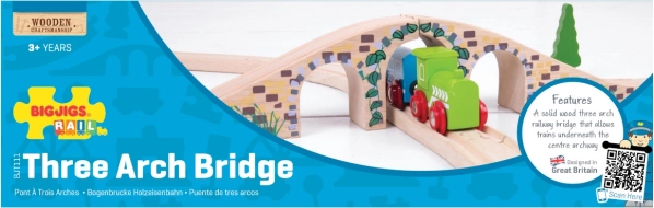 Erweitern Sie Ihre Holzeisenbahn um die hölzerne dreibogige Brücke von Bigjigs Rail – ideal zum Überqueren von Flüssen, Straßen und zum Kreuzen von Strecken. Die Brücke mit detailreicher Steinoptik und hochwertiger Verarbeitung bereichert das Spiel und ist mit den meisten Holzeisenbahnen auf dem Markt kompatibel. Hergestellt aus verantwortungsvoll beschafftem Holz, fördert sie Fantasie, Feinmotorik und Koordination.