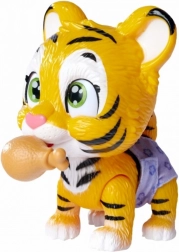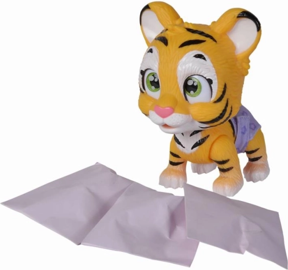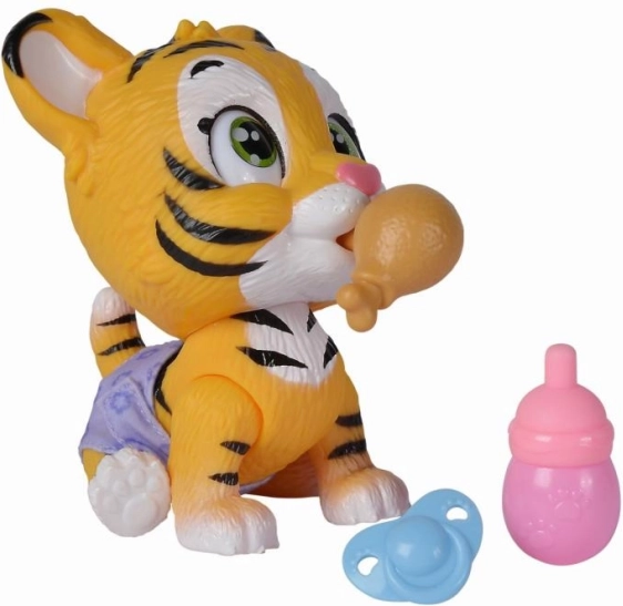 Der Tiger trinkt Wasser aus der mitgelieferten Flasche und ändert die Farbe seiner Windel – ein authentisches Spiel für Kinder.