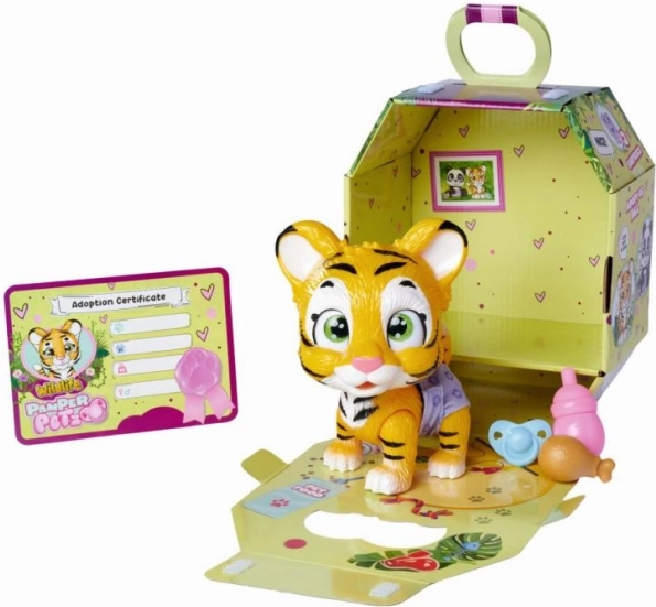 Entdecken Sie den Zauber mit dem niedlichen kleinen Tiger Pamper Petz! Dieser interaktive Tiger mit Windel ist so gestaltet, dass Kinder die Welt der Tierpflege entdecken und die Freude an der Adoption ihres neuen Freundes erleben können. Der Tiger verfügt über Funktionen, die es ihm ermöglichen, Wasser aus einer Flasche zu trinken und in eine Windel zu pinkeln, die je nach Feuchtigkeit die Farbe ändert.