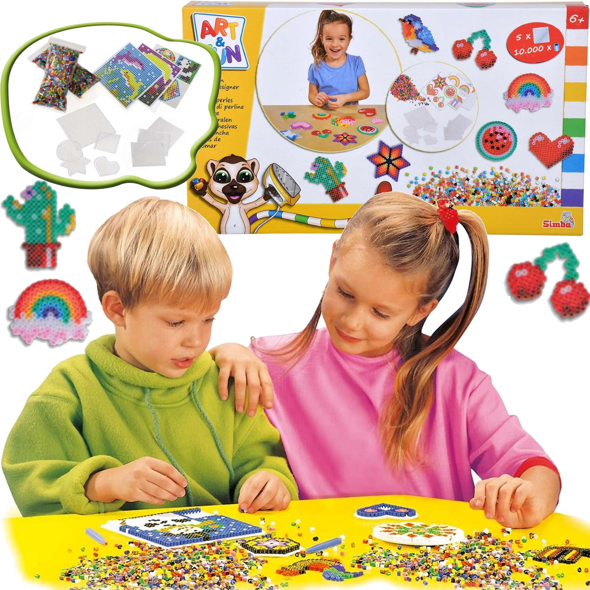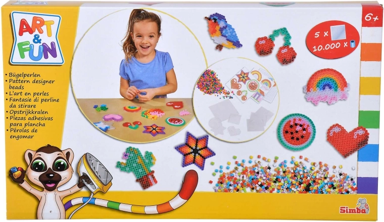 Entdecken Sie die Welt der Pixelkunst mit dem Bügelperlen-Set ART & FUN von SIMBA. Im Set enthalten sind 10.000 bunte Perlen und 5 wiederverwendbare Steckplatten, auf denen Sie beliebige Motive legen. Nach dem Abdecken mit Backpapier und dem Überbügeln durch eine erwachsene Person verschmelzen die Perlen und härten zu einer dauerhaften Dekoration aus.