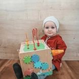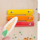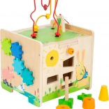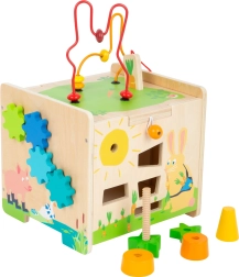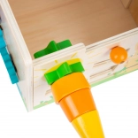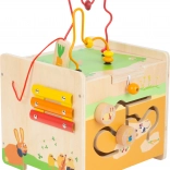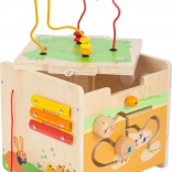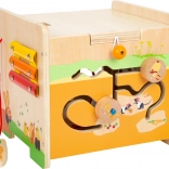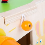 Kinder entdecken eine Fülle an Aktivitäten: Formen-Steckspiel, Drehen bunter Zahnräder, Schieben von Elementen im Labyrinth, Spielen auf dem Xylophon und eine lustige Möhre – eine schraubbare Steckkarotte, die Griffkraft und Geduld fördert. Die robuste Holzausführung und die sanften Farben mit Tierillustrationen begeistern auf den ersten Blick.