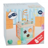Der praktische Deckel mit Perlenlabyrinth kann abgenommen und verkehrt herum im Würfel verstaut werden, sodass das Spielzeug keinen unnötigen Platz einnimmt. Ideal für Kinder ab 12 Monaten als sichere und anregende Hilfe für die ersten Entdeckungen der Welt.