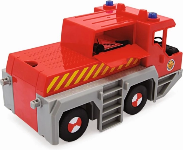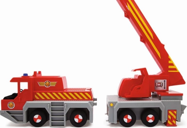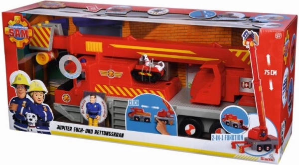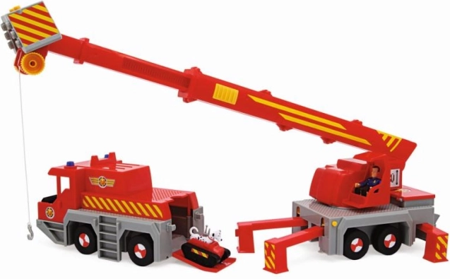 Startet die Mission mit dem Feuerwehr-Autokran 2-in-1 Feuerwehrmann Sam. Das robuste Kunststofffahrzeug ist 50 cm lang und bietet dank abnehmbarem Vorderteil zwei Spielmöglichkeiten – Fahrten mit der Kabine und Arbeiten mit dem Kran.