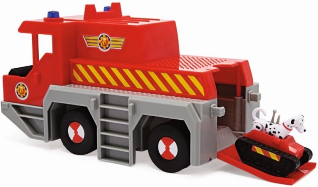 Der Arm dreht sich um 360° und fährt bis auf 75 cm aus; ausziehbare Stützen sorgen für Stabilität. Oben befindet sich eine Wasserkanone mit sicheren Kunststoffpfeilen, dazu eine mechanische Seilwinde sowie öffnende Hecktüren mit Stauraum für den Rover und Platz für Hund Radar. Zwei Soundeffekte werden per Knopf gestartet und lassen sich leicht ausschalten.