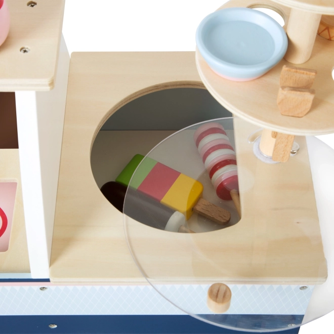 Transparente Vitrine und Gefrierfach ermöglichen realistisches Spielen und Präsentieren der Eissorten.