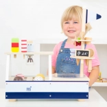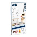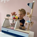 Zum Set gehören außerdem eine Schüssel mit Löffeln, Waffeln und diverses Zubehör. Alles ist in einem dezenten, geschlechtsneutralen Design gestaltet und damit ideal für jedes Kind. Maße des Standes: 45×21×47 cm, Arbeitshöhe: 11 cm.