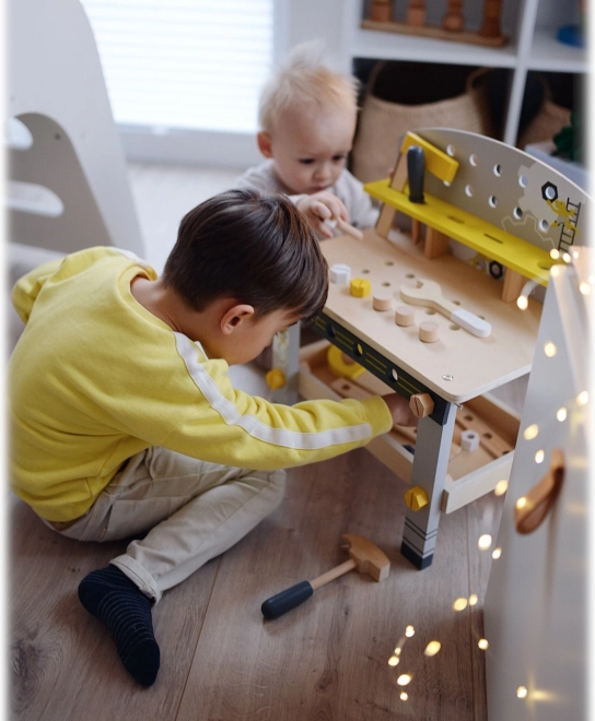 Die Werkbank enthält eine Säge, einen Schraubstock, Schraubendreher und weitere Werkzeuge, die es Kindern ermöglichen, echte Bauprojekte nachzuahmen.