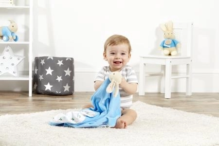 Außen in zartem Blau, innen mit bezaubernden Illustrationen inspiriert von den Geschichten Beatrix Potters. Dank der kompakten Maße von 37,5 × 37,5 cm passt es perfekt in Kinderwagen, Autositz und Bettchen.