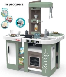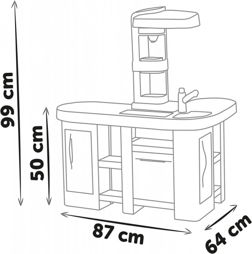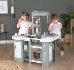 Diese geräumige Küche, inspiriert von der Marke TEFAL, bietet alles für authentisches Spiel: Arbeitsplatte, Spüle mit Armatur, Kapsel-Kaffeemaschine, Sprudelgetränke-Hersteller, Backofen, Geschirrspüler, Kühlschrank und offene Regale. Die elektronische Funktion des magischen Topfs erzeugt nach Zugabe von Wasser und Druck auf die Taste echte Bläschen, die jeden kleinen Koch begeistern.