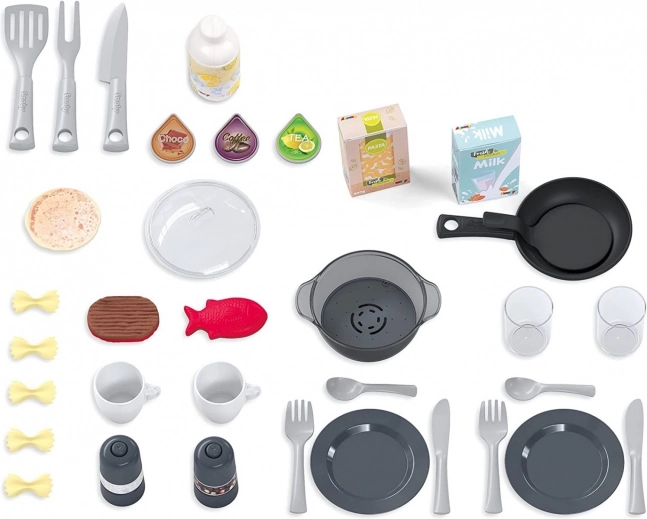 Enthalten ist ein umfangreiches Set aus 34 Zubehörteilen – Topf mit Deckel, Pfanne für Pfannkuchen, Salz- und Pfeffermühle, Geschirr und Besteck für zwei Personen, Kapseln für die Kaffeemaschine, Küchenutensilien, Einsatz für die Spülmaschine sowie Spiellebensmittel. Drehbare Bedienknöpfe, zu öffnende Ofen- und Kühlschranktüren und das typische „cric cric“-Geräusch des Sodageräts unterstützen das realistische Spiel.