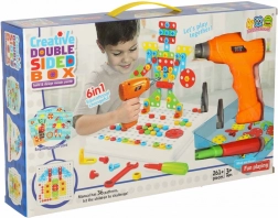 Mit der Mosaikplatte können Kinder mithilfe des Spielzeugbohrers, Schraubendrehers und Schlüssels bunte Schrauben eindrehen und vielfältige Bilder sowie 3D-Modelle erschaffen. Beleben Sie die kindliche Fantasie – die einzige Grenze ist die Vorstellungskraft der kleinen Konstrukteurinnen und Konstrukteure.
