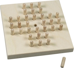 Der Holz-Solitär von Detoa bietet cleveren Spielspaß im kompakten Format. Das Spiel beginnt mit dem Entfernen des mittleren Stiftes und geht weiter mit dem Überspringen benachbarter Stifte waagerecht oder senkrecht. Jeder übersprungene Stift wird vom Brett genommen – planen Sie Ihre Züge im Voraus und versuchen Sie, am Ende nur einen übrig zu lassen.