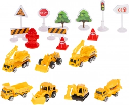 Enthalten sind Bagger, Betonmischer, Bulldozer, Kipper, Kran und weitere Fahrzeuge, ergänzt durch Schilder, Kegel und Bäumchen zur Gestaltung eigener Baustellen.
