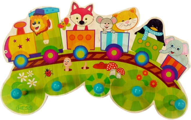 Faszinierende bunte Garderobe für das Kinderzimmer oder den Flur mit Zugmotiv und fünf Haken zum Aufhängen von Kleidung. Hergestellt aus umweltfreundlichem Holz, verwendet umweltfreundliche Farben.