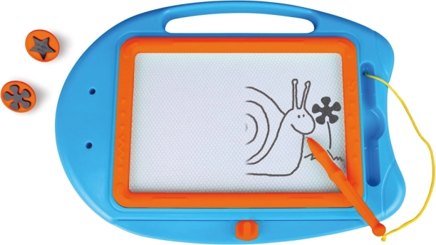 Die magnetische Fläche ermöglicht es Kindern, ohne Papier und Stifte zu zeichnen, zu schreiben und zu stempeln. Mit einem Zug wird das Bild gelöscht und es kann von Neuem gestaltet werden.