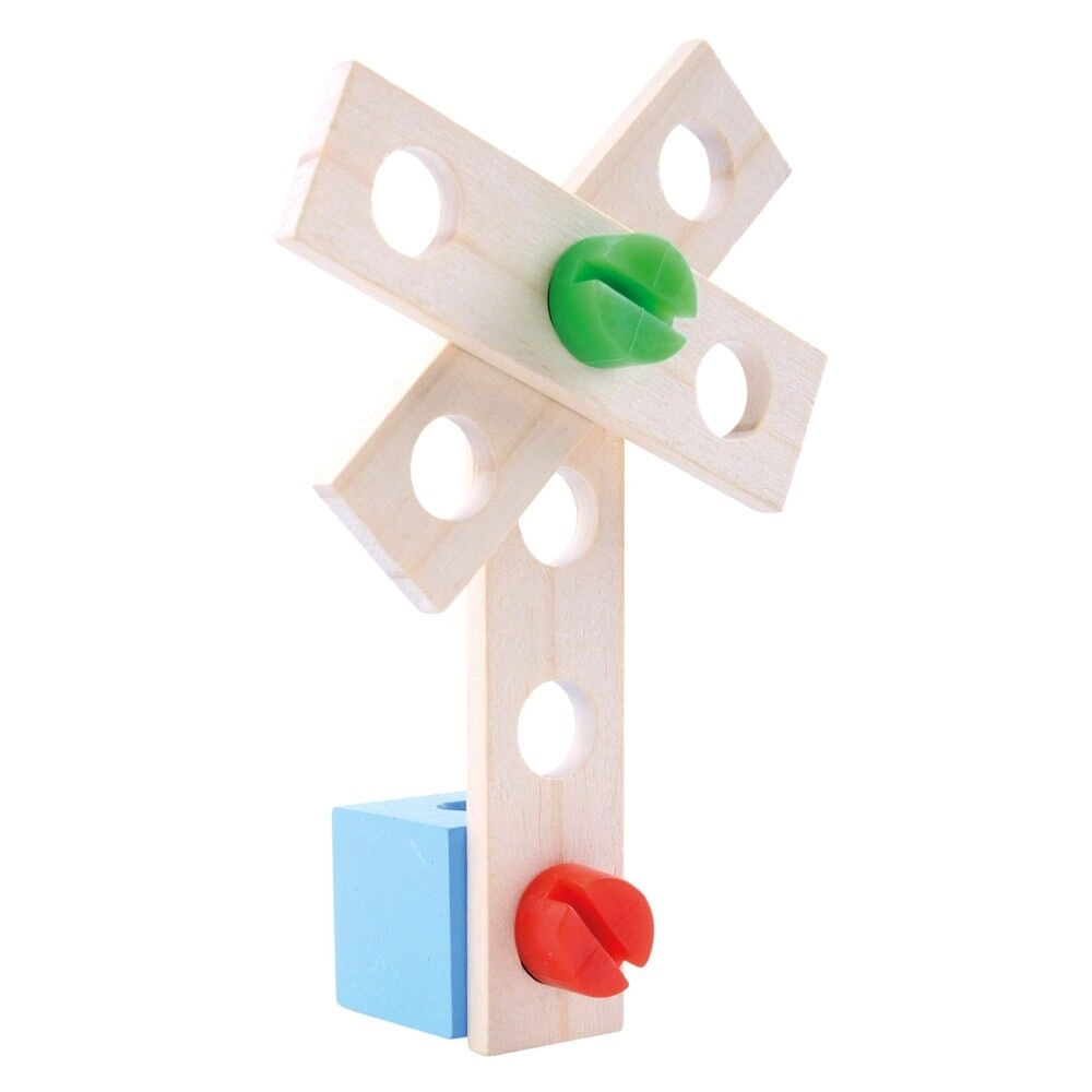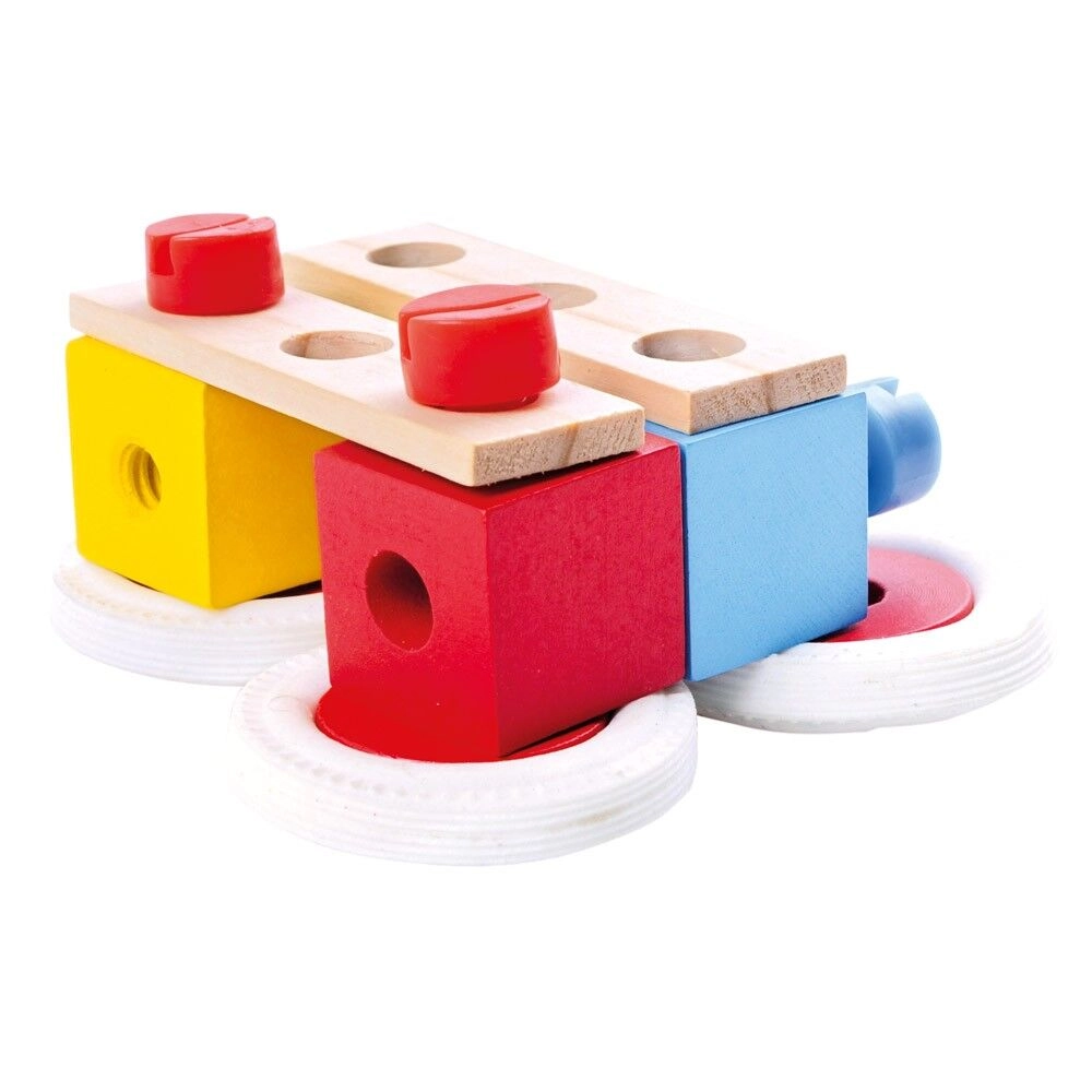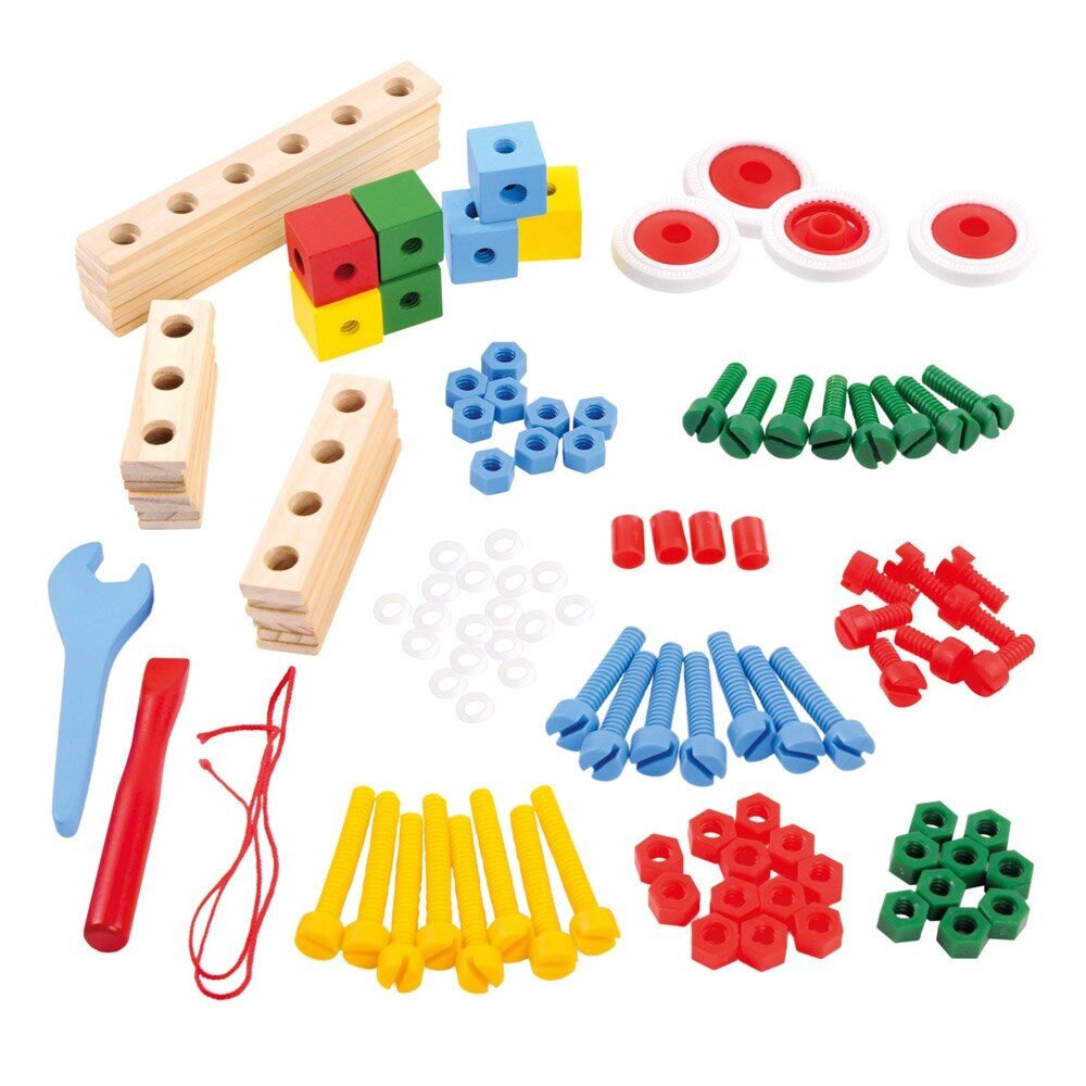Dieser vielseitige Holz-Baukasten von Bino bietet Kindern stundenlangen, kreativen Spielspaß. Dank der farbigen Schrauben, Muttern, Bausteine und Räder können immer neue Ideen ausprobiert und vielfältige Modelle gebaut werden. Das Spiel mit dem Werkzeug unterstützt den richtigen Griff, die Präzision der Bewegungen und die Hand-Auge-Koordination.