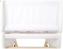 Praktischer Korb unter der Liegefläche und beidseitige, neutrale Bettwäsche mit großer Decke für Puppen bis 46 cm.