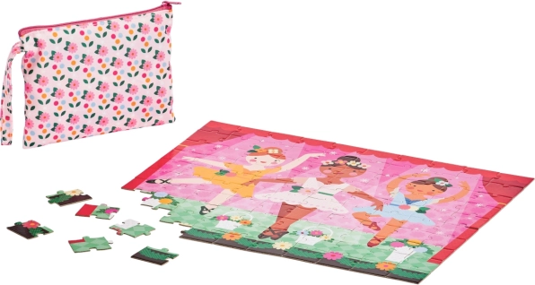 Lass die Bühne lebendig werden mit dem beidseitigen Kinderpuzzle mit Ballerinas! Das Set bietet 49 Teile und gleich 2 originelle Designs auf Vorder- und Rückseite. Dank des praktischen Reißverschluss-Etuis ideal für zu Hause und unterwegs. Hergestellt aus FSC-Papier und einer Außenhülle aus 100 % recyceltem Polyester, plastikfrei verpackt.