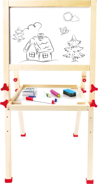 Diese hochwertige Kindertafel kombiniert eine weiße Magnetfläche zum Anheften von Bildern und zum Schreiben mit Marker mit einer klassischen Schiefertafel zum Zeichnen mit Kreide. Dank der Höhenverstellung und der stabilen Holzkonstruktion wächst sie mit dem Kind mit und passt perfekt ins Kinderzimmer oder Spielzimmer.