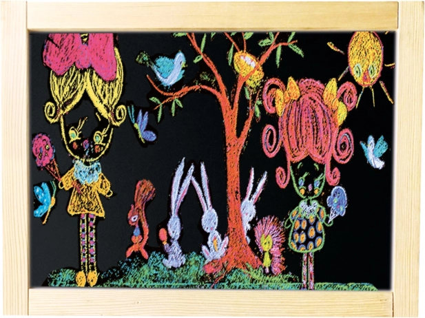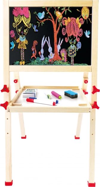 Im Lieferumfang ist alles Nötige enthalten: Kreide, Marker, Schwamm und mehrere magnetische Bildchen. Die Tafel lässt sich schnell zusammenklappen und platzsparend verstauen, sodass sie wenig Raum einnimmt. Zwei Arbeitsflächen ermöglichen, dass zwei Kinder gleichzeitig kreativ sein können.
