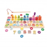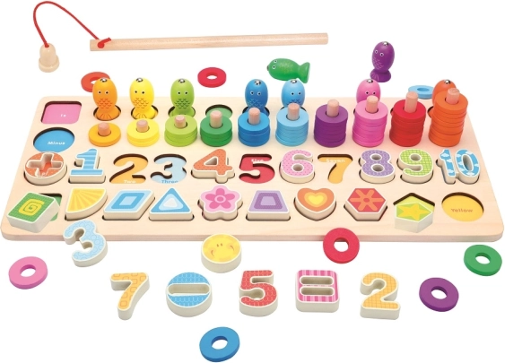 Das Spiel enthält verschiedene Elemente, die Kinder zum Angeln, zum Zusammensetzen von Zahlen oder zum Stapeln von Ringen verwenden können. Alle Teile sind so gestaltet, dass kleine Kinderhände sie leicht greifen können, was ihre Selbstständigkeit und kreatives Entdecken fördert.