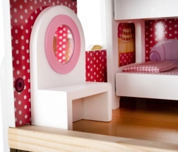 Das Puppenhaus enthält LED-Beleuchtung, die nach den Wünschen des Kindes platziert werden kann, um den Zauber der imaginären Welt zu verstärken. Es ist in drei Ebenen aufgeteilt, die durch wunderschöne weiße Treppen verbunden sind, und bietet fünf Zimmer sowie einen Balkon, was ausreichend Platz für eine vierköpfige Puppenfamilie bietet.