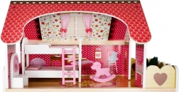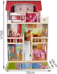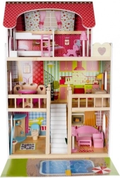 Das Puppenhaus aus Holz ist ein großartiges Spielzeug, das die Kreativität und soziale Fähigkeiten der Kinder fördert. Es hat drei Ebenen, die durch schöne weiße Treppen verbunden sind, und enthält insgesamt fünf Räume, einen Balkon und einen Garten mit Pool. Es ist mit verschiedenen farbenfrohen und angenehmen Elementen ausgestattet, die für langen Spielspaß sorgen.