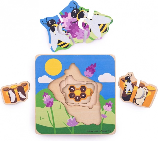 Die geschichtete Konstruktion mit sich schrittweise verändernden Bildern zeigt die einzelnen Entwicklungsphasen – vom Ei bis zur erwachsenen Biene. Die Teile sind für Kinderhände geeignet und halten dank der stabilen Ausführung auch häufiger Nutzung stand.