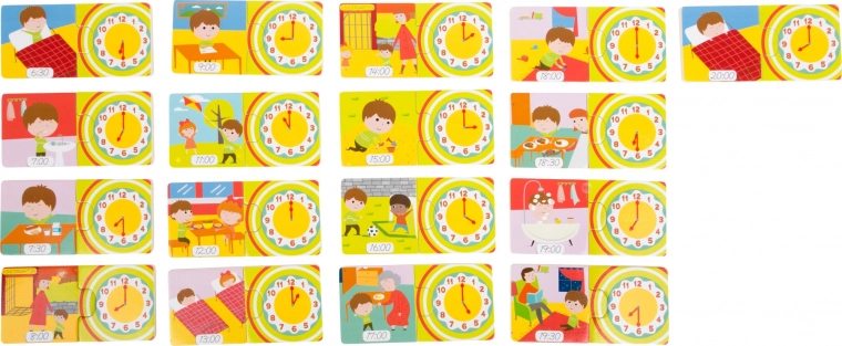 Wie spät ist es? Mithilfe niedlicher Bilder alltäglicher Aktivitäten lernen Kinder spielerisch die Uhrzeit mit diesem Spiel. Es müssen immer zwei Teile zusammengesetzt werden. Das Spiel kann auch als Memo genutzt werden. Es lehrt nicht nur die Zeit, sondern fördert auch die Feinmotorik und die Kommunikation. Ein großartiges Lernspiel, das wirklich jedem Spaß macht. Hauptmerkmale: lernt die Uhrzeit kennen, kann auch als Memo verwendet werden, trainiert motorische Fähigkeiten