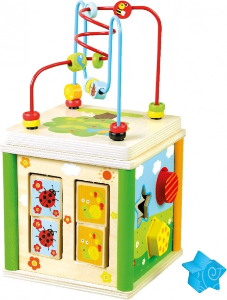 Durch die verschiedenen Aktivitäten üben Kinder spielerisch logisches Denken, Konzentration und Kreativität. Die Würfelkonstruktion besteht aus robustem Holz und ist mit Elementen aus Metall ergänzt – ideal für tägliche Entdeckungsreisen von Kindern.
