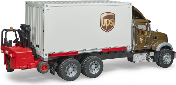 Bruder LKW Mack UPS bietet viele Funktionen, die einen echten LKW simulieren. Dank zu öffnender Türen der Kabine und des Laderaums können Sie einfach im Inneren des Modells hantieren. Inklusive integriertem Gabelstapler mit variabler Gabel für verschiedene Arten von Ladungen.