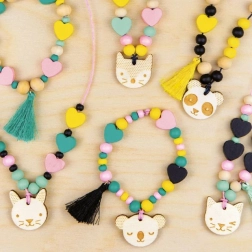 Dieses Kreativset begeistert alle kleinen Schmuckdesigner. Dank der umfangreichen Ausstattung können Kinder leicht Holzperlen, Herzchen, Quasten und Tieranhänger kombinieren und so einzigartige Accessoires ganz nach ihrer Fantasie kreieren. Eine übersichtliche Anleitung ist ebenfalls enthalten, sodass das Basteln einfach und spaßig ist.