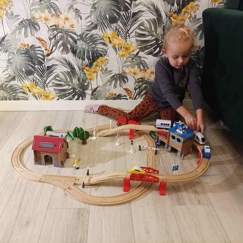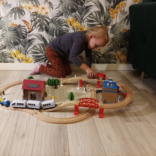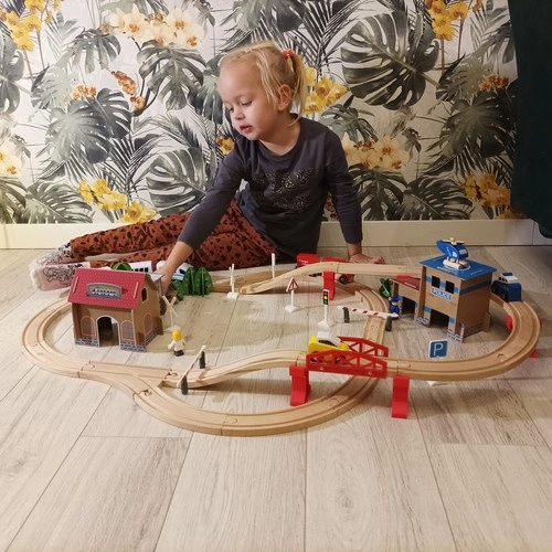 Entfacht die Fantasie – dieses Spielzeug stimuliert die Kreativität und Vorstellungskraft der Kleinen. Kinder können ihre eigenen Gleise entwerfen und bauen sowie eine Landschaft rundherum gestalten. Das Testen der selbst gebauten Strecken macht jedem Kind Freude. Fördert Entwicklung – nicht nur ein großartiges Vergnügen, sondern auch eine Förderung der räumlichen Wahrnehmung und der Feinmotorik, was die Hand-Augen-Koordination unterstützt, die in der Zukunft wichtig ist. Sicher – alle Teile sind gut geschliffen und mit umweltfreundlichen Farben bemalt. Es gibt keine hervorstehenden, scharfen Teile, die Verletzungen verursachen könnten. Set mit 89 Teilen – präzise gefertigte Teile, die nach Belieben arrangiert werden können. Beinhaltet z.B. Schienen, Zug, zwei Autos, Polizeihubschrauber mit Landeplatz, Lastwagen mit Anhänger, Figuren, Bahnhof und vieles mehr. Magnetische Verbindung – keine unnötigen Haken, die sich lösen könnten. Starke Magnete halten das Set zusammen, selbst wenn man es in die Luft hebt.