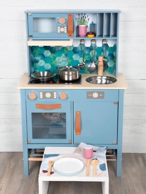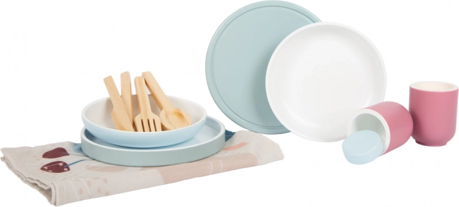 Modernes und robustes Kindergeschirrset von Small Foot, hergestellt aus hochwertigem Holz mit trendigem Farbdruck für kreative Rollenspiele in der Küchenwelt.