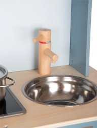 Die Kinderküche in rauchblauem Ton mit stilvollen Ledergriffen bietet ein realistisches Kocherlebnis.