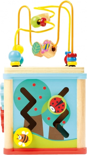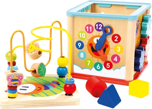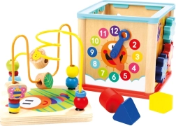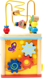 Dieser farbenfrohe hölzerne motorische Spielwürfel bietet Kindern ab 12 Monaten viele Möglichkeiten zu spielen und gleichzeitig zu lernen. Dank der Uhr mit Zeigern lernen Kinder spielerisch die Zeit kennen, das Perlenlabyrinth fördert den Griff und die Koordination und die weiteren Seiten des Würfels trainieren Logik, Formen und Farben.