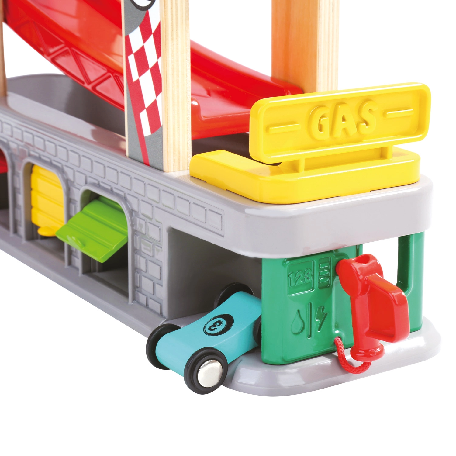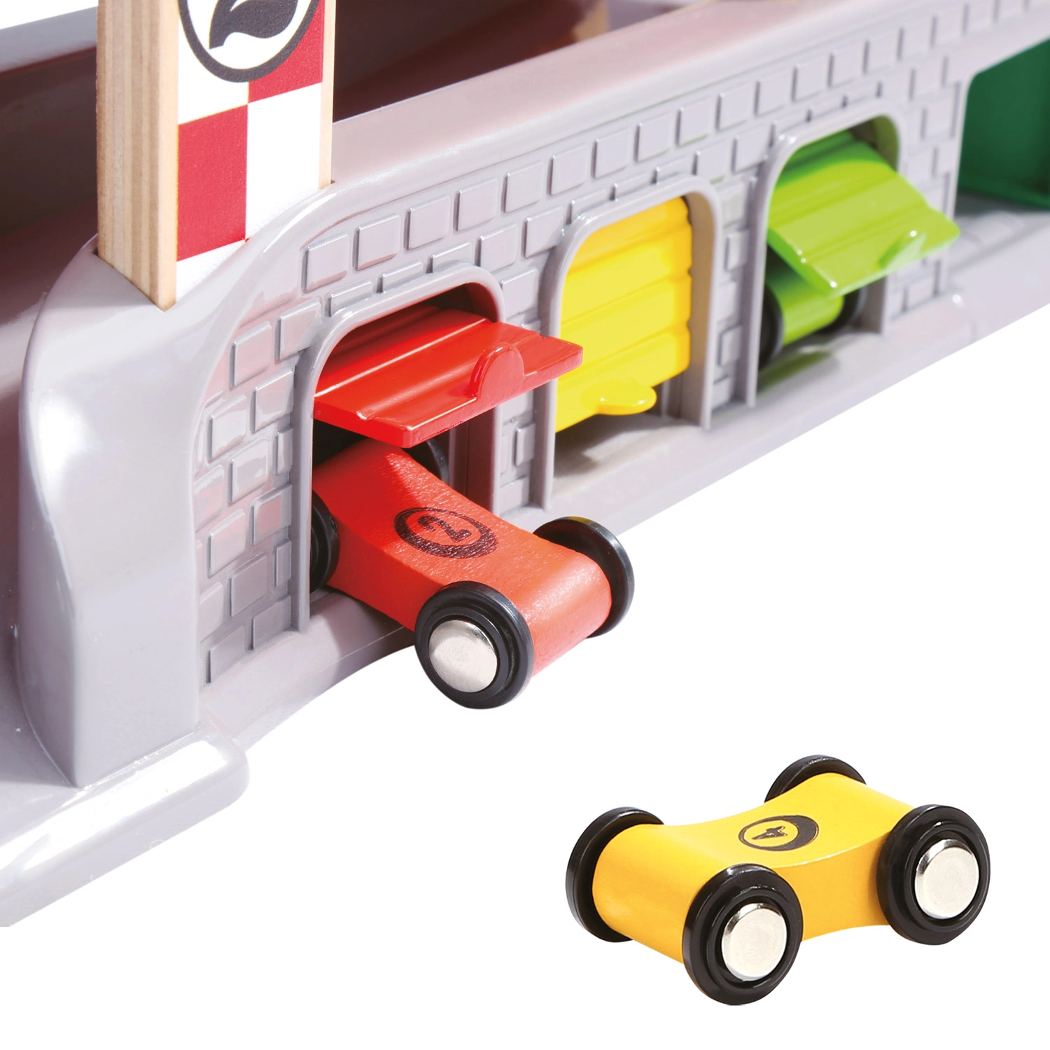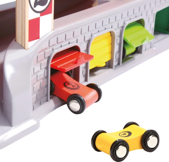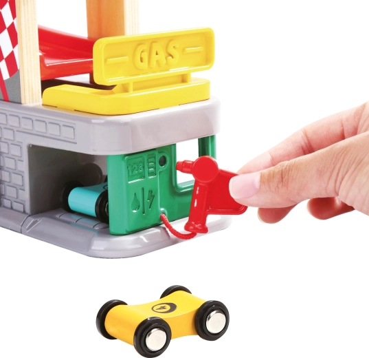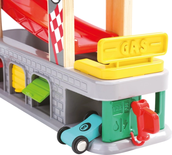 Drei Garagen mit aufklappbaren Türen und eine Tankstation unterstützen fantasievolle Szenarien – von Boxenstopps über Parken bis zum Sortieren der Autos.