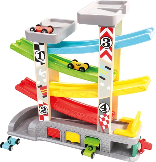 Bunte Rampen ermöglichen eine flüssige Abfahrt der Autos von den oberen Plattformen in die unteren Garagen – ideal für erste Rennen und zur Förderung der Koordination.