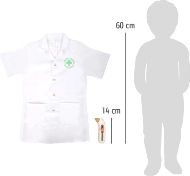 Das small foot Arzt-Set für Kinder bringt alles mit, was kleine Ärztinnen und Ärzte für ihre erste Praxis brauchen. Der Kittel in Größe 110 eignet sich für Kinder mit einer Körpergröße von 105–110 cm und lässt sich dank Druckknöpfen leicht an- und ausziehen. Die Holzutensilien liegen angenehm in der Hand, sind langlebig und sicher für das Kinderspiel.