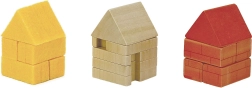 Robuste Holzteile und bunte Formen laden zum Bauen der Häuschen und zum Zusammensetzen des Wolfs ein. Kinder entwickeln spielerisch Feinmotorik und Fantasie.