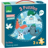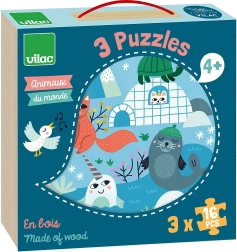 Drei Bilderpuzzles mit Motiven von Savanne, Wald und Eisberg stellen Kindern die Welt der Tiere in ihrer natürlichen Umgebung vor.