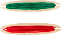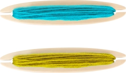 Vier Holzspulen mit farbiger Wolle und Grundfäden ermöglichen den Start ohne weitere Zukäufe – einfach auspacken und losweben.